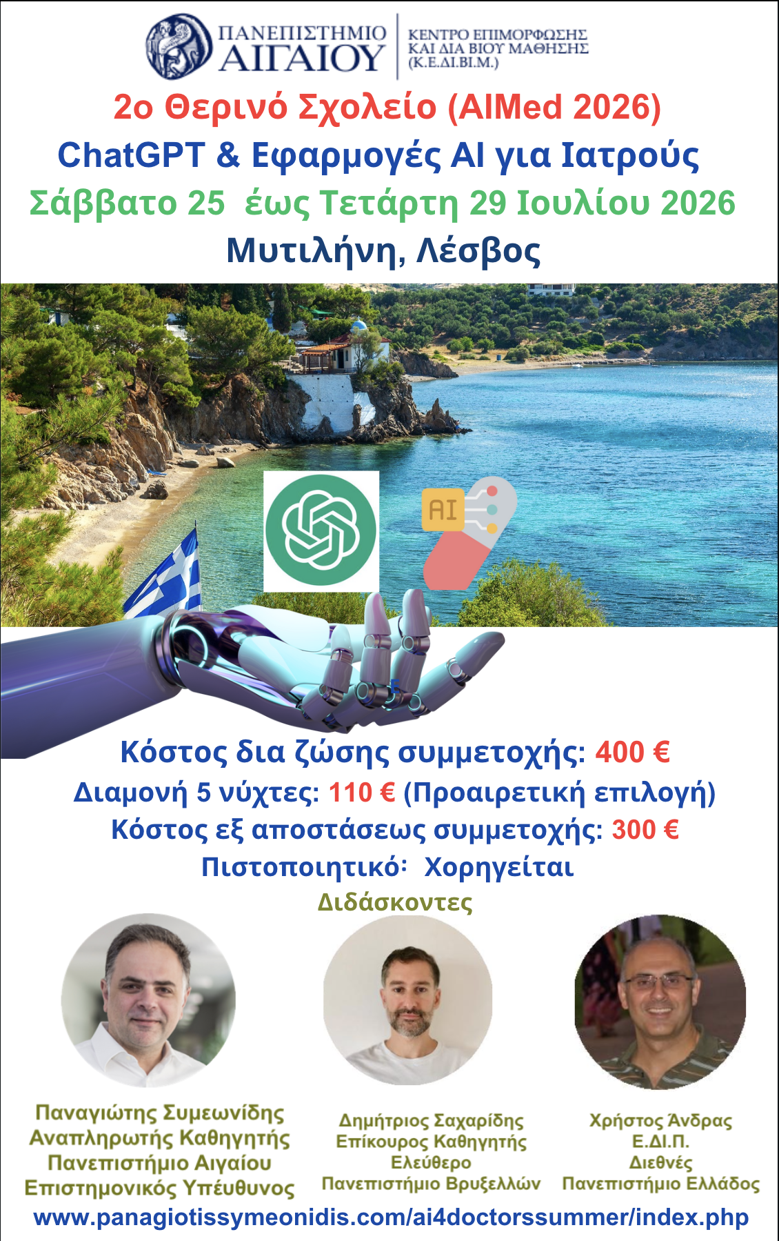 2o Θερινό Σχολείο ChatGPT και Εφαρμογές AI για Ιατρούς - AIMed2026 ΠΟΛΥΤΕΧΝΙΚΗ ΣΧΟΛΗ - Τμήμα Μηχανικών Πληροφοριακών και Επικοινωνιακών Συστημάτων25 Ιουλ 2026 έως 29 Ιουλ 2026 Λέσβος